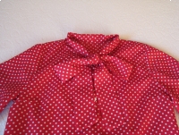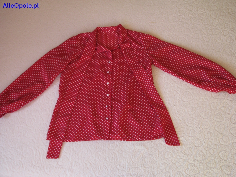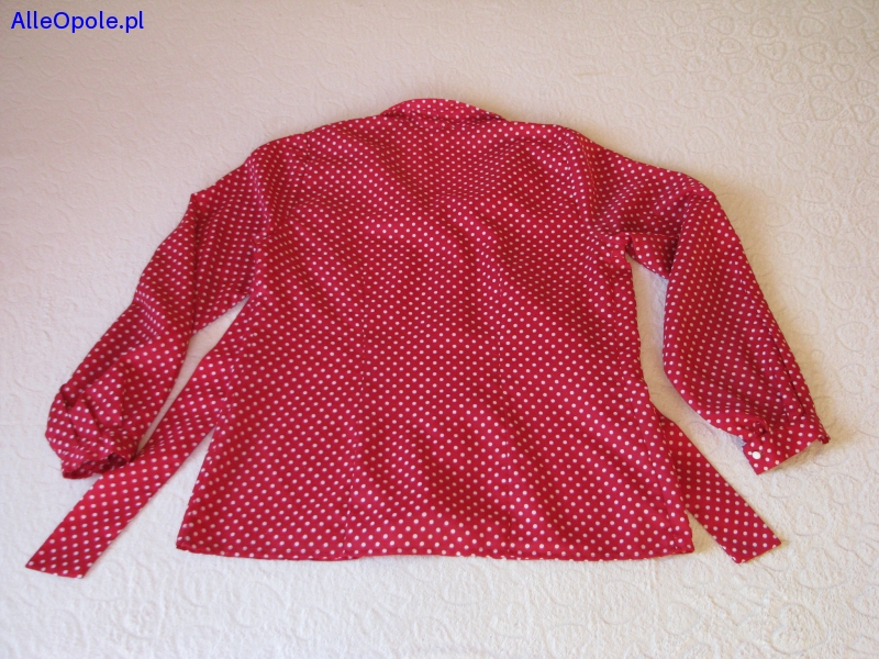 Witam, Sprzedam wygodną, bardzo kobiecą koszulę / bluzkę koszulową z długim rękawem, rozmiar L/XL w kolorze wiśniowym w białe groszki. Koszula zapinana jest na białe, ozdobne guziczki, posiada kołnierzyk wykończony ozdobnym wiązaniem / szalem; kołnierzyk można nosić wywinięty lub jako stójka, wiązanie może być umieszczone przy szyi lub niżej – jako kokarda lub luźno opadający szal – w zależności od upodobań. Rękawy koszuli wykończone są mankietami zapinanymi na guziczek, z tyłu koszula posiada szwy taliujące, nadające sylwetce ładny kształt. Koszula wykonana jest z przyjemnej w dotyku, lekkiej, przewiewnej, nie gniotącej się tkaniny. Koszula w stylowe groszki, praktyczna i wygodna, doda uroku każdej kobiecie o każdej porze roku, sprawdzi się zarówno w codziennych, jak i eleganckich stylizacjach, można komponować ją zarówno ze spodniami, jak i spódnicami – z pewnością urozmaici garderobę i wyróżni w tłumie :) Wymiary: długość całkowita – 67 cm, szerokość od pachy do pachy – 49 cm, szerokość w pasie 2 x 47 cm, szerokość u dołu (biodra) 2 x 54 cm, szerokość w ramionach 37 cm, długość rękawa od ramienia – 59 cm, długość rękawa od pachy – 45 cm. Koszula jest używana, czysta, w bardzo dobrym stanie – widocznym na zdjęciach. Zapraszam do zakupu :)