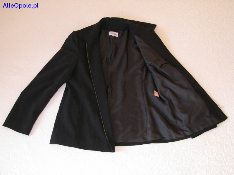 Witam, Sprzedam czarny, klasyczny żakiet - marynarkę w rozmiarze 42 / XL wykonaną z dobrej jakości, miękkiego i przyjemnego w dotyku materiału z dodatkiem elastanu. Marynarka zapinana jest na zamek w złotym kolorze, z przodu ma 2 wsuwane, ukryte w szwie. kieszenie, od spodu wykończona jest podszewką. Żakiet ma prosty, klasyczny, kobiecy krój, leciutko podkreśla wcięcie w talii, nadając sylwetce ładny wygląd, a przyjemny, nie gniotący i ładnie układający się na sylwetce materiał zapewnia swobodę ruchów oraz pozwala czuć się komfortowo. Marynarka bardzo praktyczna, dobra na każdą porę roku, z powodzeniem można łączyć ją ze wszystkimi stylami, stanowi znakomite uzupełnienie codziennych stylizacji, dodając im kobiecości i stylu. Żakiet bardzo dobrej jakości, solidnie wykonany, jest jak nowy, w idealnym stanie, nie sprany, czysty, niezniszczony, bez plam, dziurek i innych wad. Rozmiar 42 / XL, dokładne wymiary poniżej: długość całkowita 70 cm, szerokość w ramionach 42 cm, szerokość mierzona od pachy do pachy 53 cm x 2, szerokość w pasie 50 cm x 2, szerokość u dołu 58 cm x 2, długość rękawa po zewnętrznej stronie 62 cm, długość rękawa po wewnętrznej stronie 41 cm. Zapraszam do zakupu :)