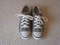 Sprzedam trampki, tenisówki firmy Tom Tailor w rozmiarze 34 (wkładka wewnątrz 21,5 cm), wykonane z mocnej tkaniny bawełnianej w kolorze jasno-popielatym. Czubek buta biały, gumowy, wnętrze buta białe, tekstylne, wygodna, elastyczna, gumowa podeszwa zapewniająca doskonałą przyczepność. Trampki sięgają pod kostkę, wiązane są białymi sznurówkami. Wkoło buta, czarna obwódka, logowane otwory na sznurówki, logo firmy z boku buta, na czubku, pięcie i podeszwie.