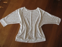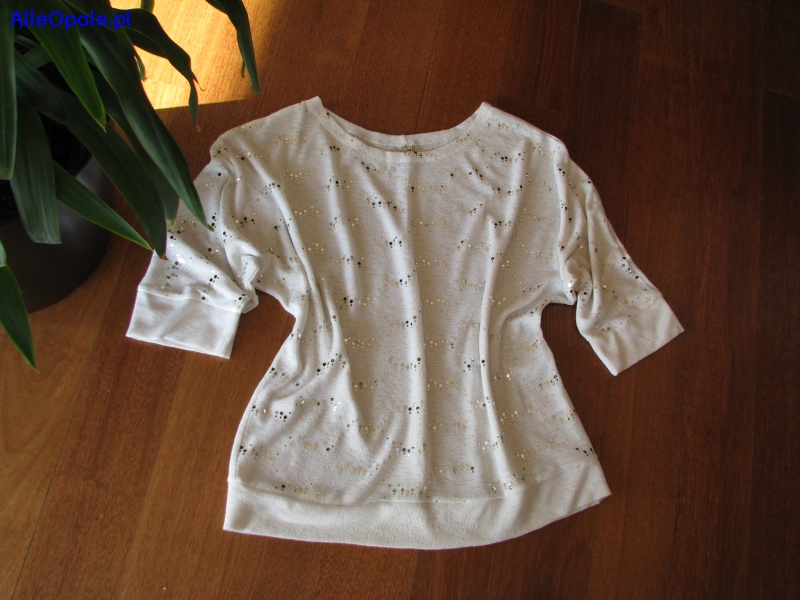 Witam, Sprzedam elegancki, dobry gatunkowo sweterek, bluzkę typu nietoperz w rozmiarze XL niemieckiej firmy MULTIBLU. Bluzka wykonana z przyjemnej w dotyku i przewiewnej dzianinki w białym kolorze. Przód bluzki na całej powierzchni ozdobiony jest mieniącymi się na srebrno cekinkami, tył gładki. Sweterek zakładany jest przez głowę, wykończenie pod szyją okrągłe, rękawki po założeniu ¾. Sweterek o designerskim fasonie, jego wygodny, luźny krój zapewnia maksymalną swobodę ruchów i doskonale zatuszuje wszelkie niedoskonałości sylwetki. Sweterek z subtelnie mieniącymi się dodatkami, stanowi znakomite uzupełnienie codziennych stylizacji, dodając im delikatności, kobiecości i stylu a przyjemny materiał, ładnie układający się na sylwetce, pozwoli czuć się komfortowo przez cały dzień. Bluzka uniwersalna, dobrej jakości, sprawdzi się o każdej porze roku i przy każdej okazji. Sweterek jest mało używany - w idealnym stanie, nie sprany, czysty, niezniszczony, bez plam i zaciągnięć. Rozmiar z metki XL dobry również dla osób w rozmiarach M i L. Poniżej podaję rzeczywiste wymiary sweterka leżącego na płasko (+/-): długość całkowita 70 cm, długość od brzegu dekoltu do końca rękawka 57 cm, szerokość od „pachy do pachy” 62 cm x 2, szerokość w pasie i u dołu 56 cm x 2. Zapraszam do zakupu :)