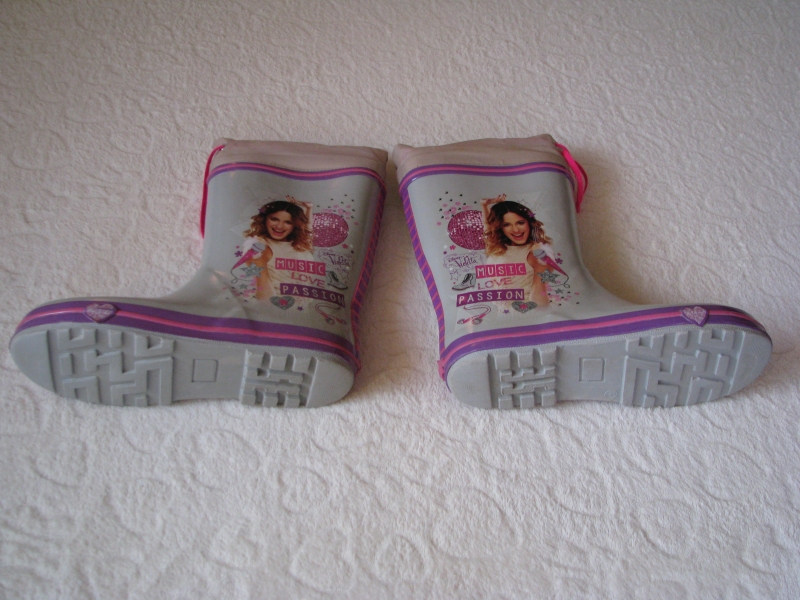 Sprzedam wygodne buty dziewczęce na deszczowe dni - kalosze firmy Disney, seria z wizerunkiem Violetty w rozmiarze 35. Obuwie w kolorze jasnego popielu z akcentami fioletu i różu, wykonane z materiałów syntetycznych: z zewnątrz solidna, trwała i nieprzemakalna gumowa cholewka zapewniająca suchość stóp, od wewnątrz, dla większego komfortu, cholewka wyłożona przyjemnym materiałem oraz wyciągana piankowa wkładka dodatkowo pokryta materiałem. Dodatkową ochronę przed deszczem i wlewaniem się wody podczas biegania po kałużach daje uszczelniający, ortalionowy kołnierz ze ściągaczem umieszczonym w górnej części cholewki, który pozwala również na lepsze dopasowanie obuwia do nogi. Kalosze posiadają antypoślizgową, grubą, gumową podeszwę, która jest fakturowana, tak aby stabilizowała i nie ślizgała się na mokrym podłożu.