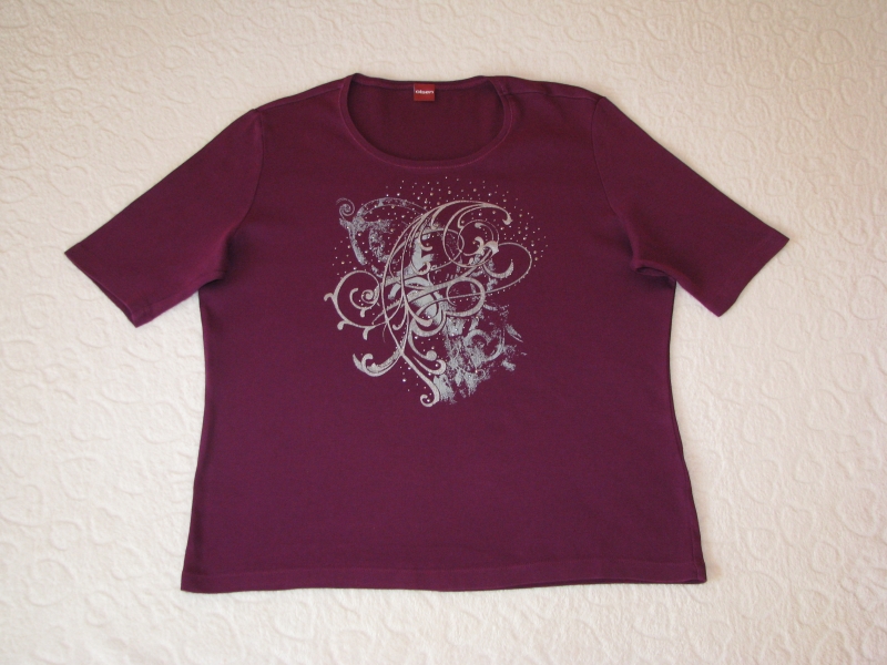 Sprzedam bardzo oryginalną, markową i dobrą gatunkowo koszulkę damską, T-shirt z krótkim rękawem firmy OLSEN. Koszulka lekko taliowana, wykonana z wysokiej jakości, miękkiej bawełny w kolorze bordowego fioletu, z przodu posiada popielato-srebrną aplikację ozdobioną dodatkowo srebrnymi, metalowymi cekinkami, okrągły dekolt wykończony błyszczącymi nićmi w kolorze koszulki, tył gładki.