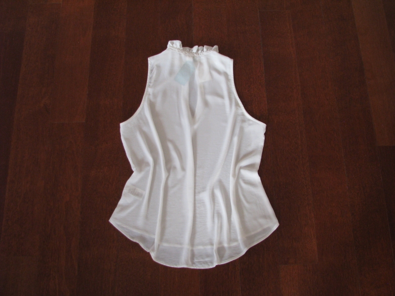 Sprzedam zwiewną, letnią bluzkę z odkrytymi ramionami w kolorze białym, rozmiar 44, wykonaną w całości z lekkiego, delikatnego i bardzo przyjemnego materiału. Bluzka posiada rozszerzany krój z zaokrąglonym dołem – z tyłu jest lekko wydłużona, pod szyją wykończona jest falbanką i wycięciem - łezką zapinaną na złoty, półkolisty guziczek.