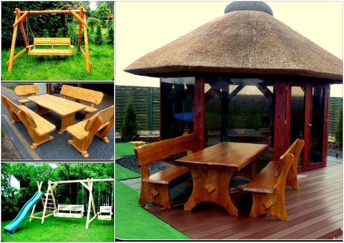 Meble ogrodowe, drewniane, barowe, huśtawki, stół, ławka, krzesła