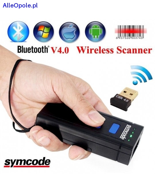 Bezprzewodowy, kieszonkowy czytnik kodów kreskowych pracujący przez bluetooth lub adapter USB.