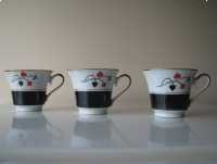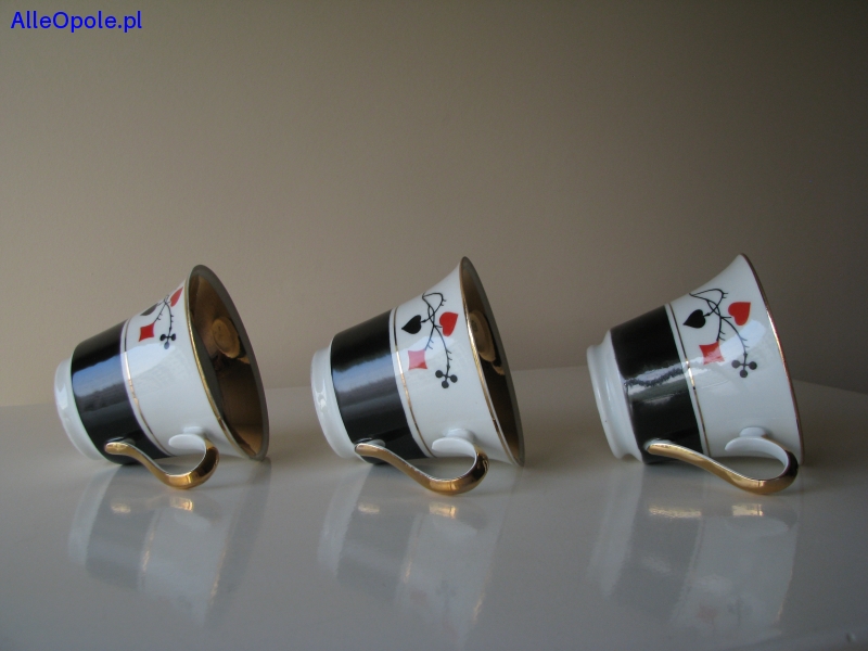 Sprzedam trzy piękne, porcelanowe filiżanki z dekoracją karcianą projektu Wincentego Potackiego, wyprodukowane i sygnowane przez fabrykę porcelany Ćmielów.