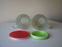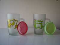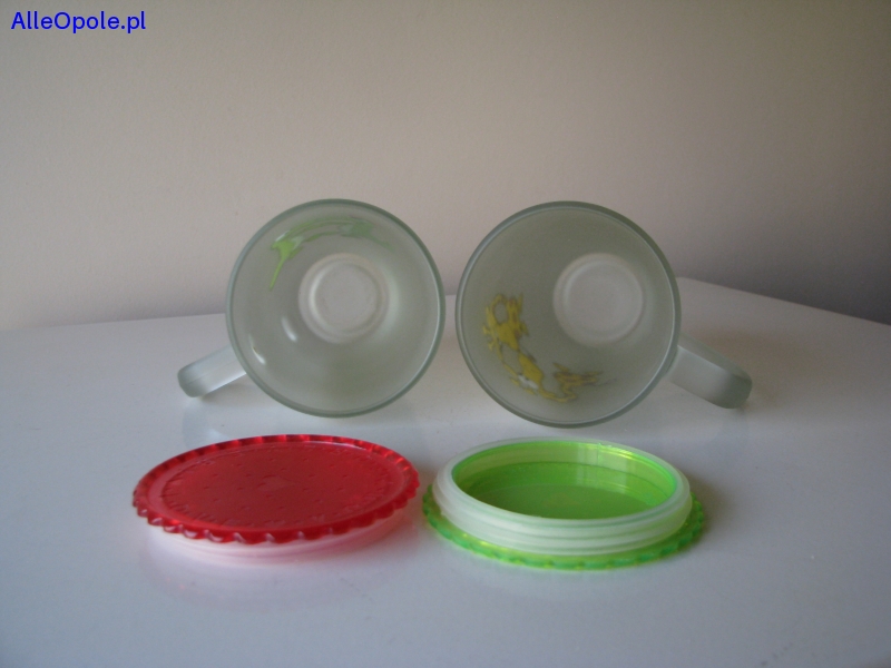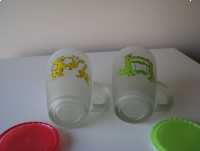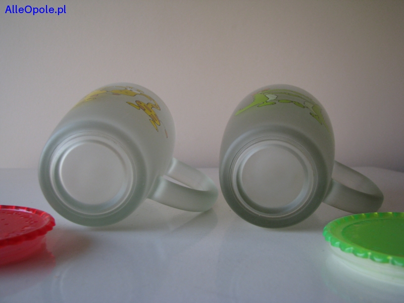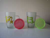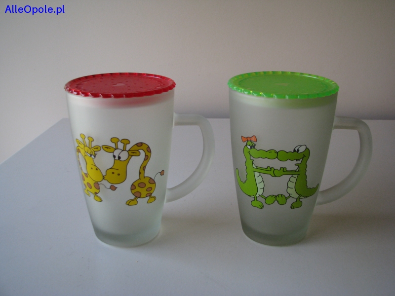 Sprzedam dwie urocze szklanki - kubki ze zmatowionego / szronionego szkła z pokrywkami z nadrukiem zakochanych zwierzaków.