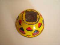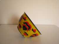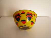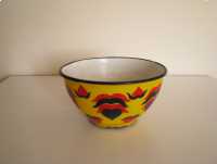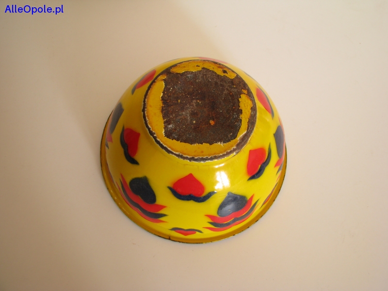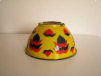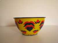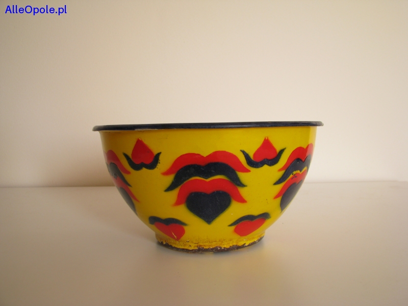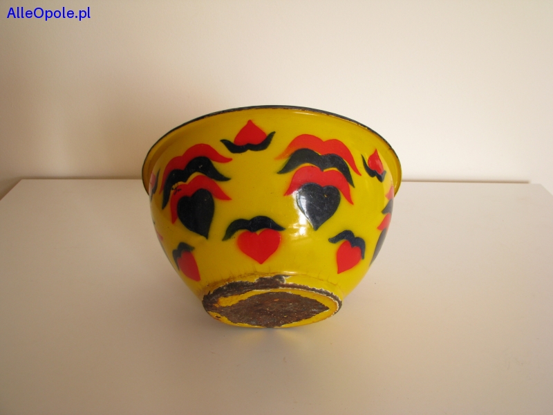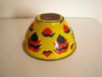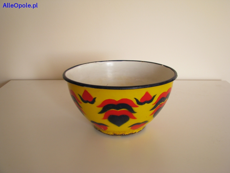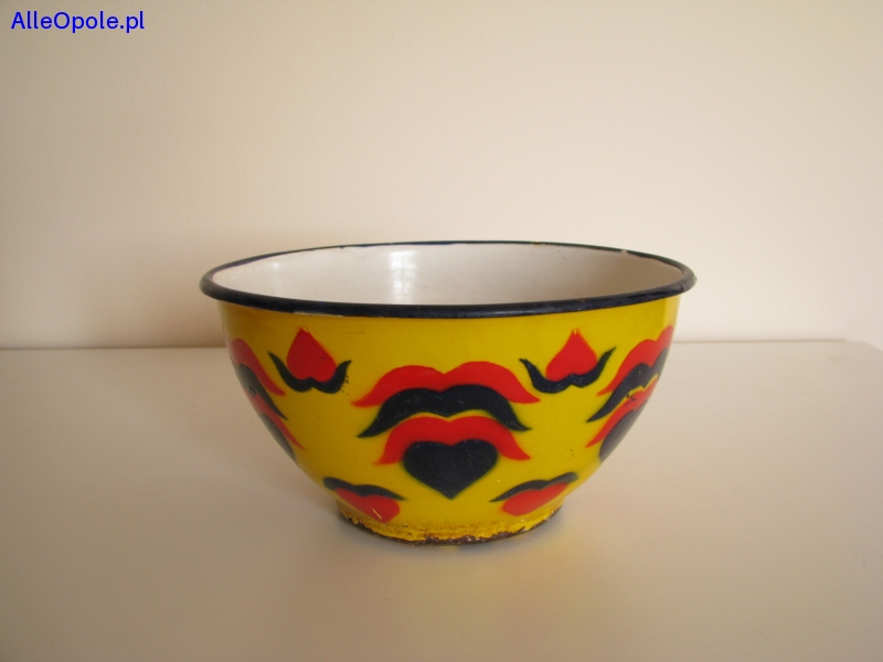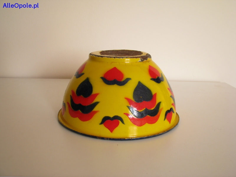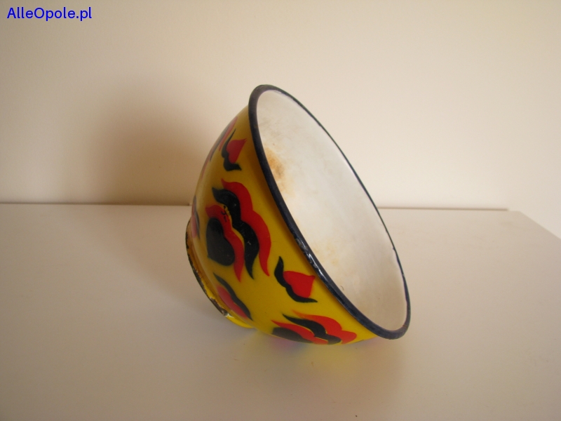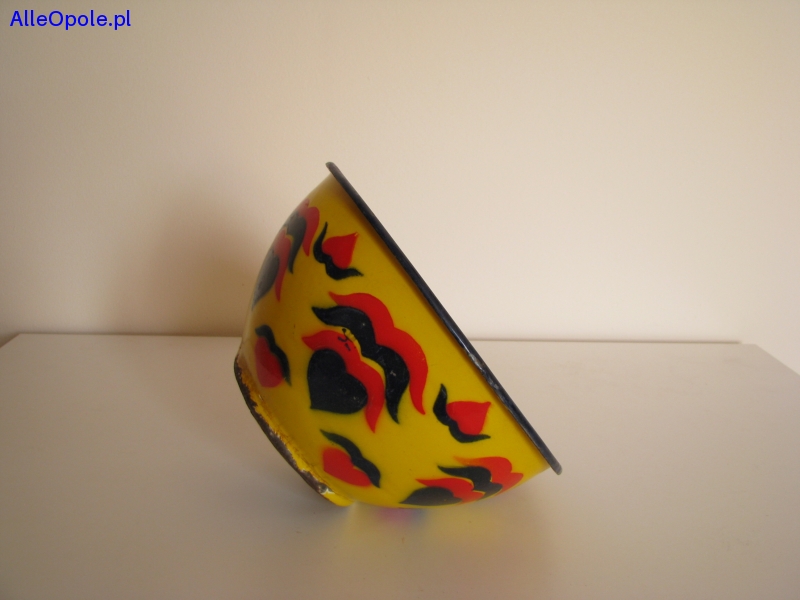 Miska o ciekawym kształcie z czarnym rantem, od zewnątrz pokryta jest żółtą emalią i naniesionymi granatowo czerwonymi wzorami. Od wewnątrz miska pokryta jest białą emalią.