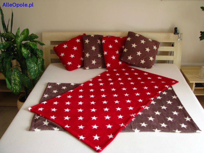 Poduszki wykonane są z miękkiego, przytulnego pluszu w kolorze ciemno-czerwonym (3 szt) i brązowym (3 szt) z motywem gwiazdek w białym kolorze. Materiał odporny na rozciąganie i przecieranie. Poszewki zapinane są na zamek, łatwo je zdjąć i odświeżyć.