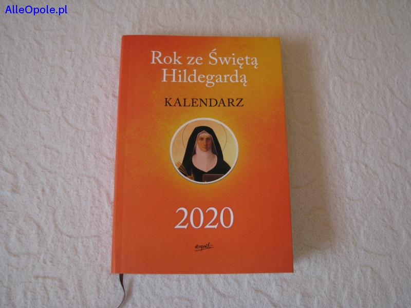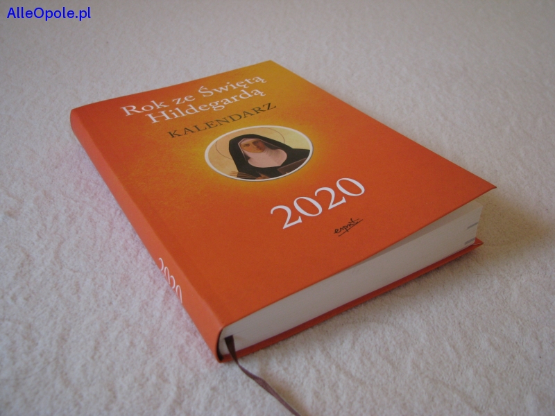 Sprzedam ciekawy i pomocny, nieużywany kalendarz książkowy na 2020 rok w pomarańczowym kolorze z wizerunkiem św. Hilegardy.