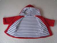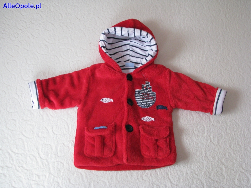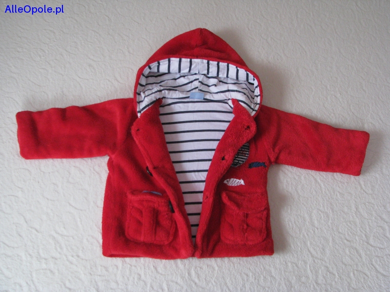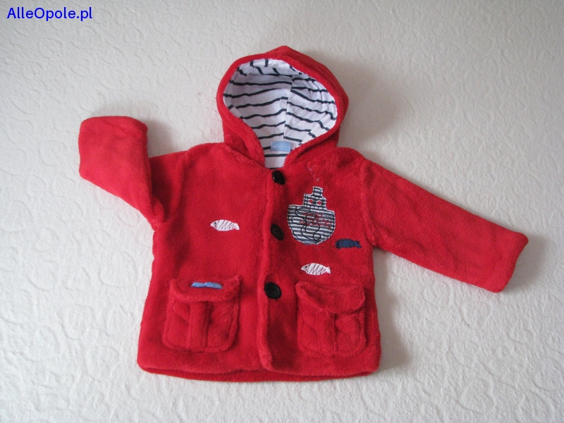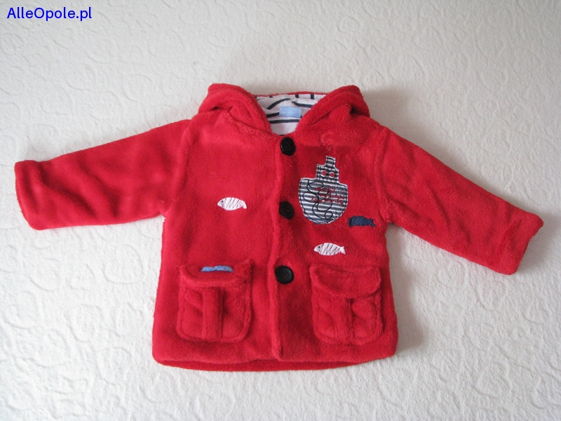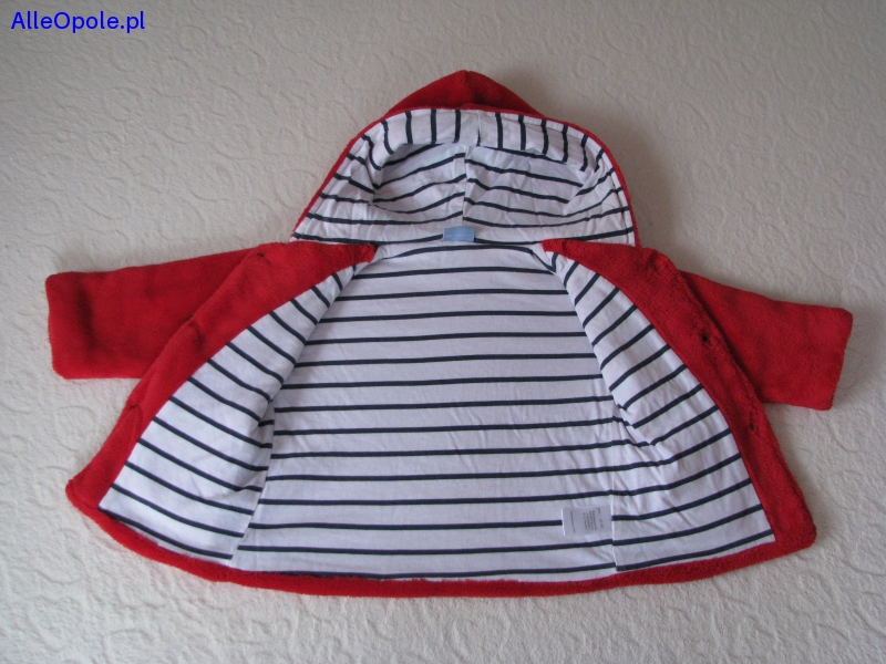 Wykonana jest z dobrego gatunkowo, oddychającego i przyjemnego w dotyku grubego miśka, podszyta materiałem bawełnianym w kolorze białym w granatowe paski – jest bardzo milutka :) Ładnie wygląda z wywiniętymi rękawkami. Zapinana jest na guziki, posiada dwie zewnętrzne kieszonki z klapką oraz kaptur, podszyty tak, jak cała kurteczka, na przedzie kurtki umieszczone są ozdobne naszywki, które dodają całości uroku.