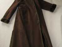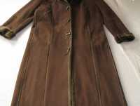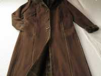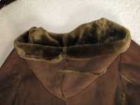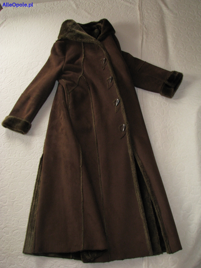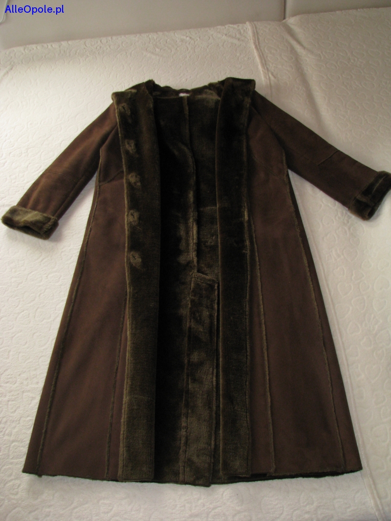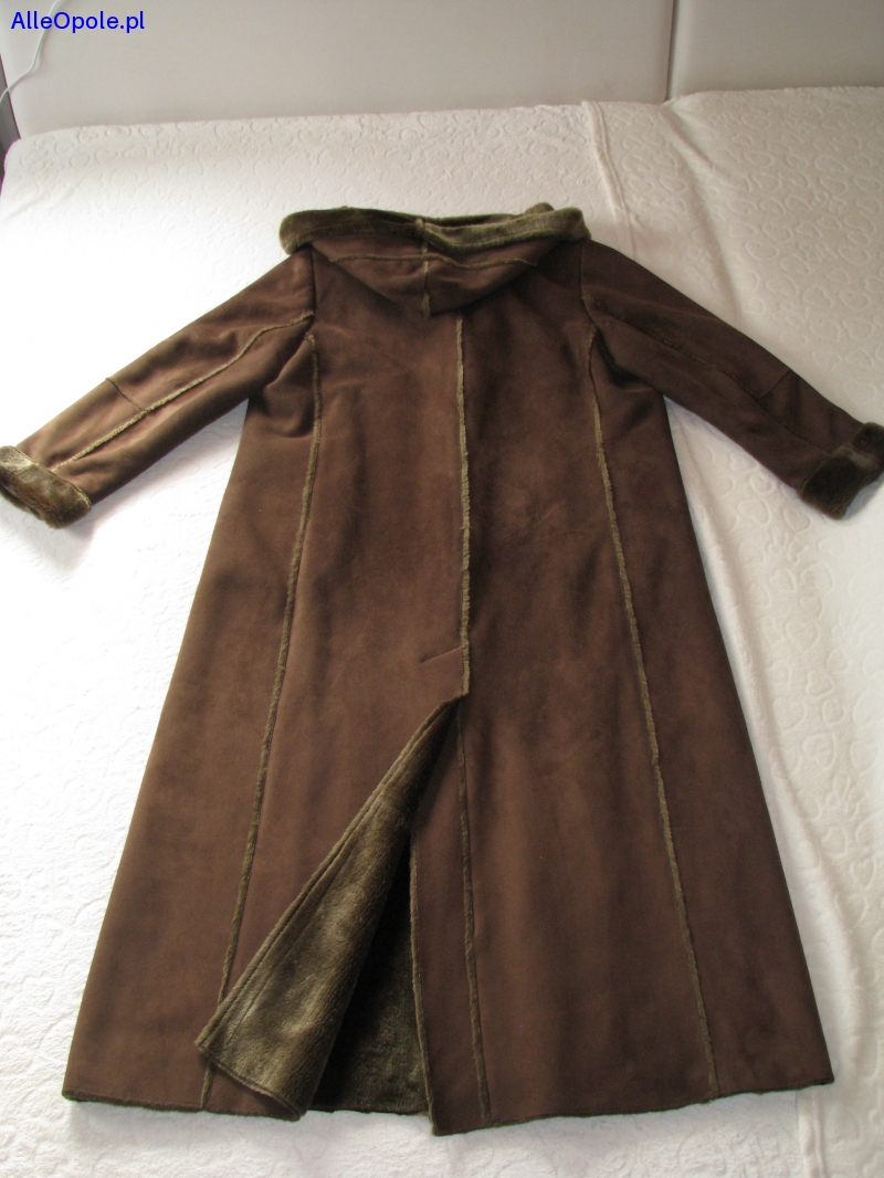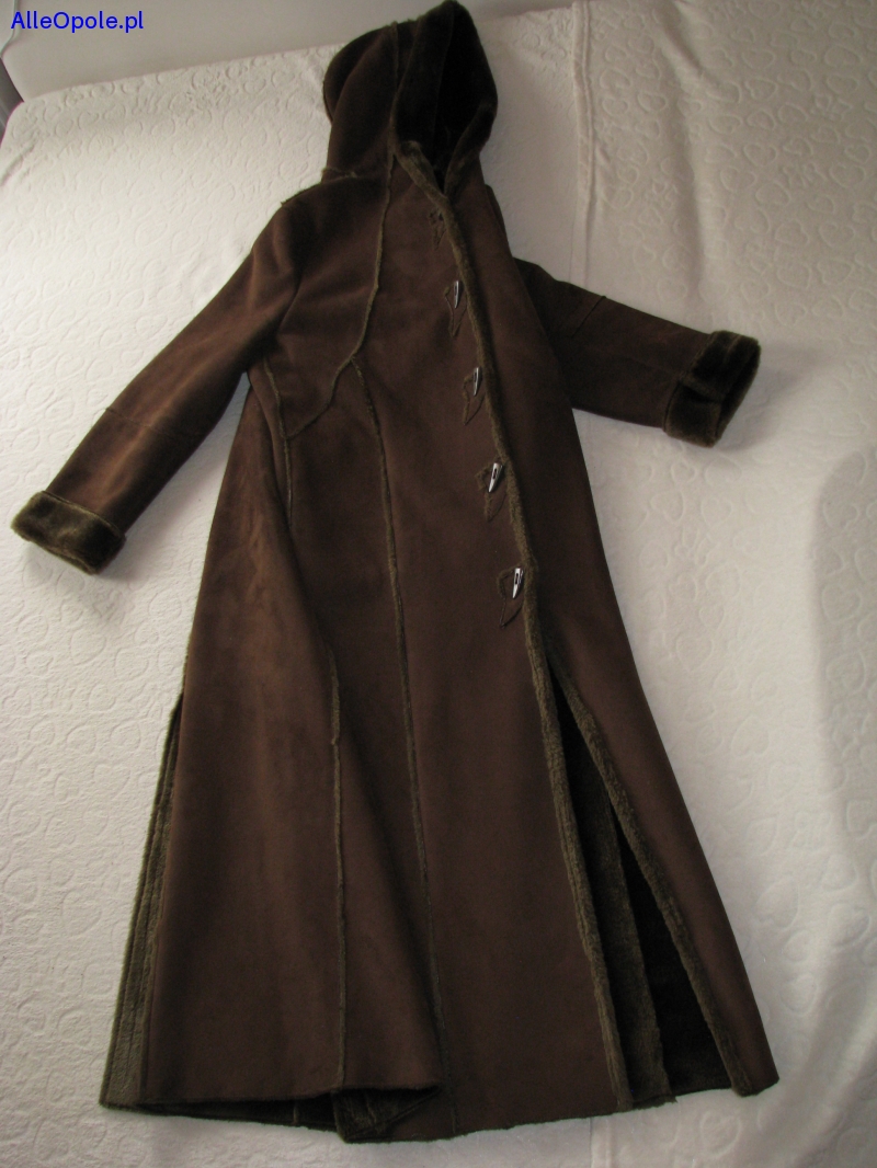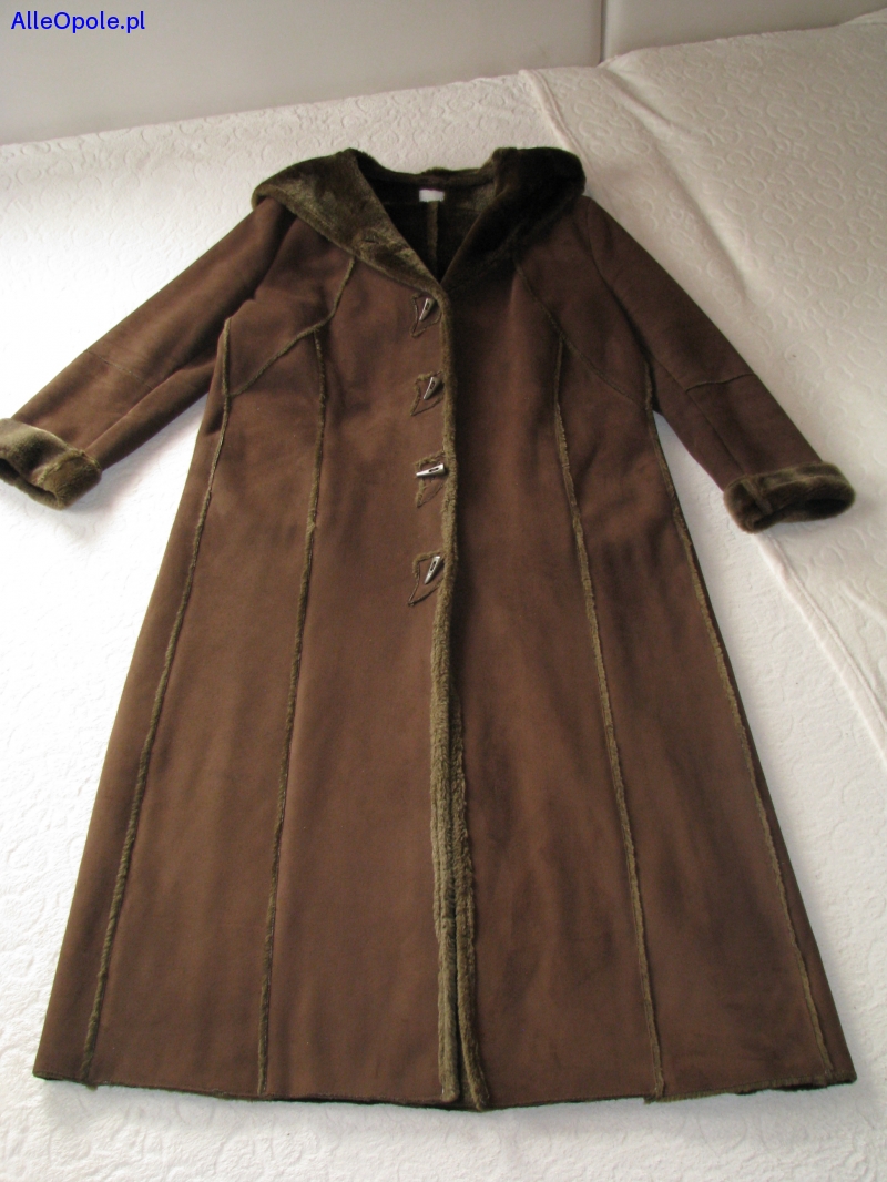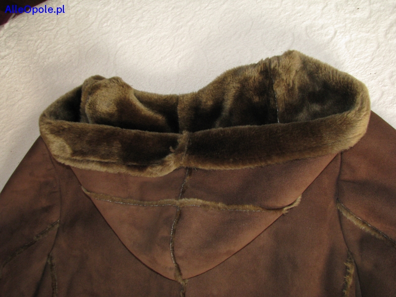 Sprzedam ciepły, dobrej jakości kożuszek damski z kapturem w rozmiarze XXL, wykonany z przyjemnej, miłej w dotyku skóry ekologicznej, w kolorze ciepłego, czekoladowego brązu.