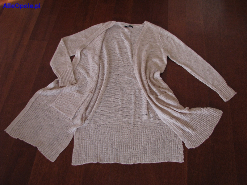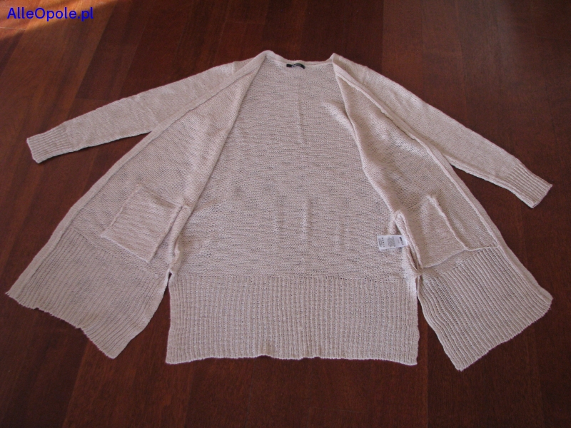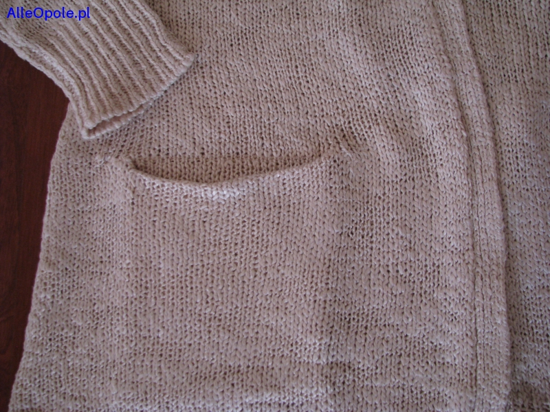 Sweterek bez zapięcia, ma proste długie rękawy, na wysokości bioder 2 wpuszczane kieszenie i rozporki po bokach, tył jest gładki.