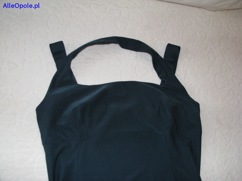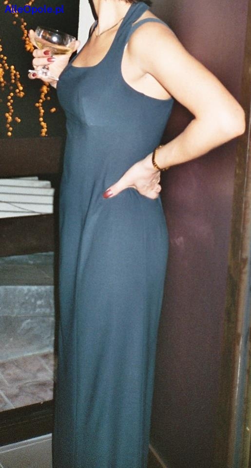 Sprzedam niepowtarzalną, długą, wieczorową suknię z dużym rozcięciem z boku w kolorze ciemnej, stłumionej zieleni.