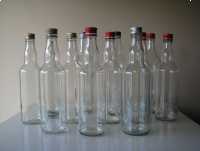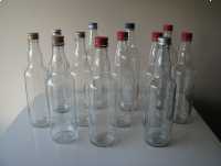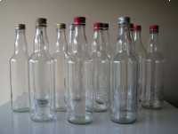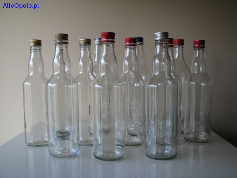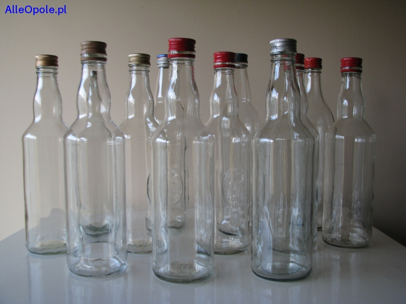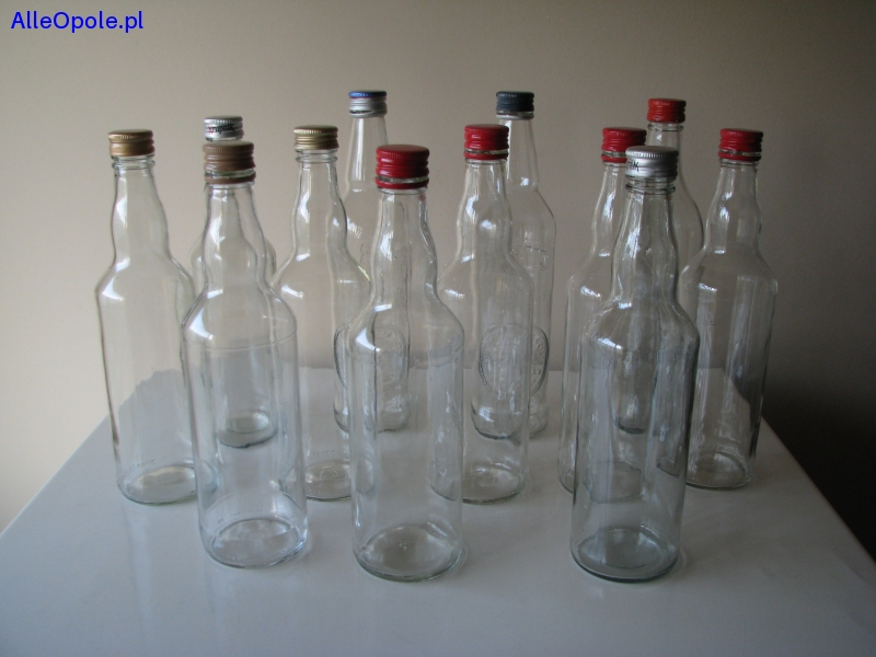 Sprzedam butelki o klasycznym kształcie, wykonane z bezbarwnego szkła, z nakrętkami, o pojemności 0,5 l.