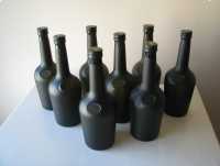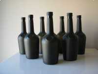 Sprzedam bardzo eleganckie butelki z nakrętkami, o pojemności 0,5 l o pięknym kształcie, zwężającym się ku dołowi, wykonane z bardzo ciemnego szkła z satynowym połyskiem.