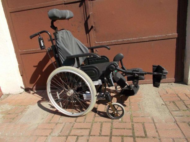 Wózek inwalidzki specjalny z elektryczną regulacją (pilot) konta pochylenia oparcia, konta pochylenia całego siedziska (oparcie plus siedzisko razem). Ponadto dodatkowo regulacja ręczna konta pochylenia podnóżków oraz zagłówek do stabilizacji głowy.